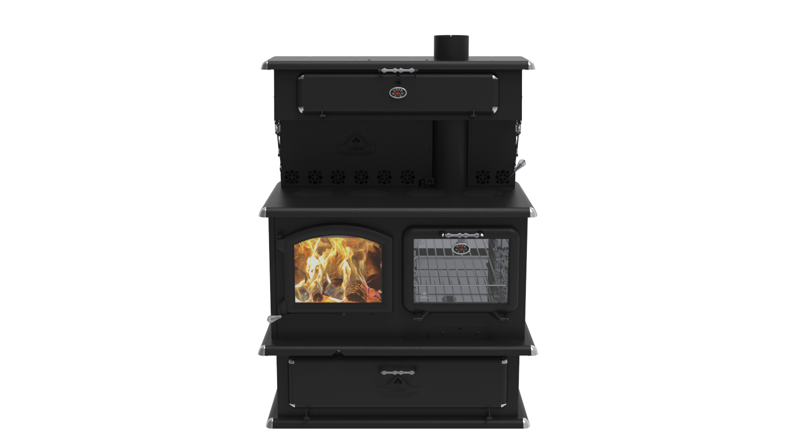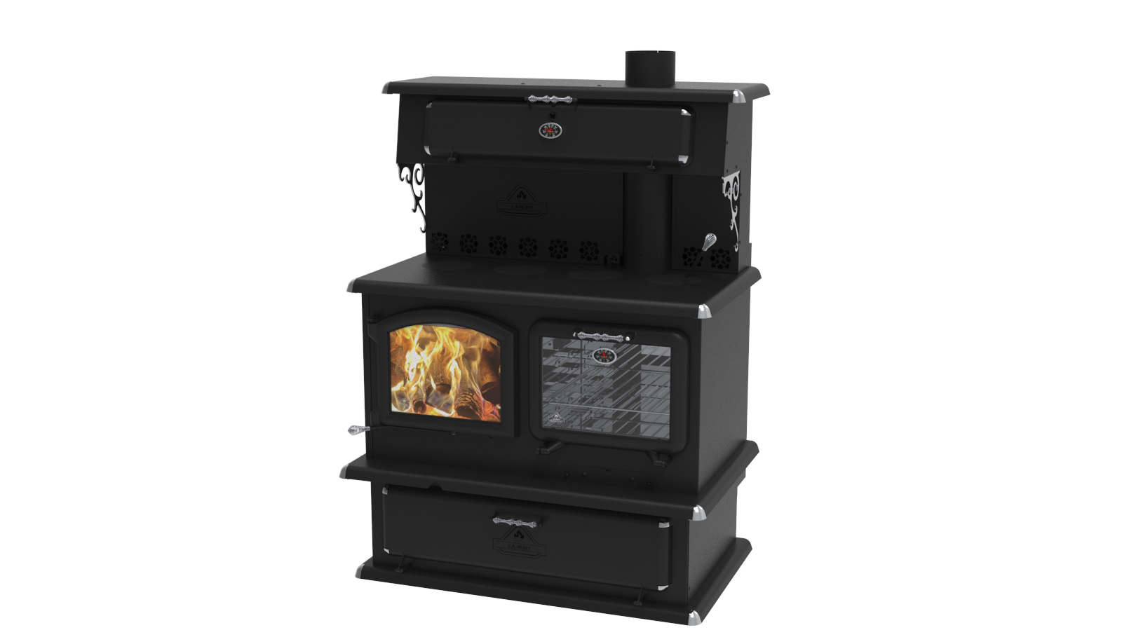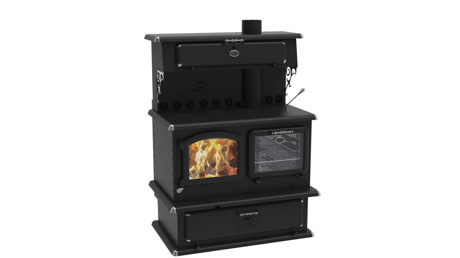 The Cocinera Wood Cookstove is a stylish and functional freestanding cooking and heating solution for your home. Built with an arched cast iron firebox door and a square oven door, it blends durability with elegance. This versatile model offers a food warmer, oven rack, four removable cooking lids, and a storage drawer, making it ideal for both heating and meal preparation. Suitable for spaces from 92m² to 278m², it produces up to 32kW of heat (Canadian Standards) with low emissions of only 1.56g/h. The firebox handles logs up to 558mm, and the Cocinera Wood Cookstove includes an outdoor air intake with optional ducting for enhanced efficiency.